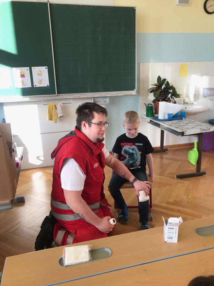 Die 2a hatte Besuch vom Roten Kreuz. Die Kinder haben gelernt, Dreieckstücher und Verbände anzulegen und …