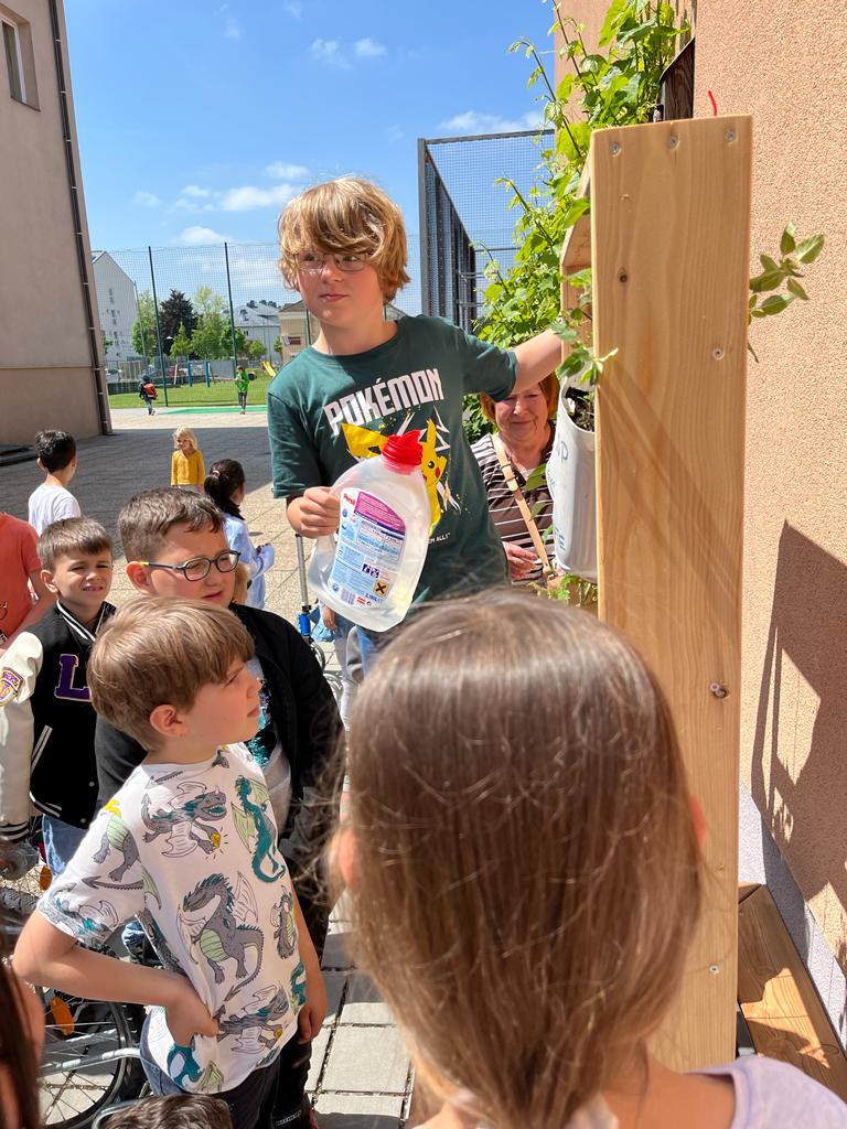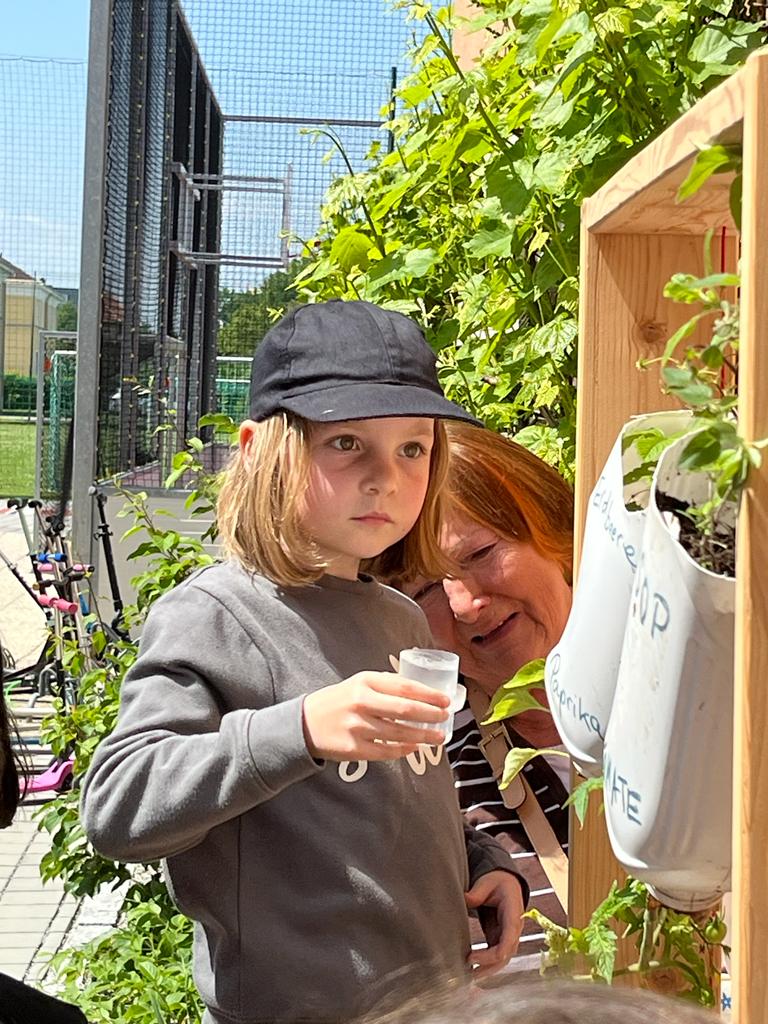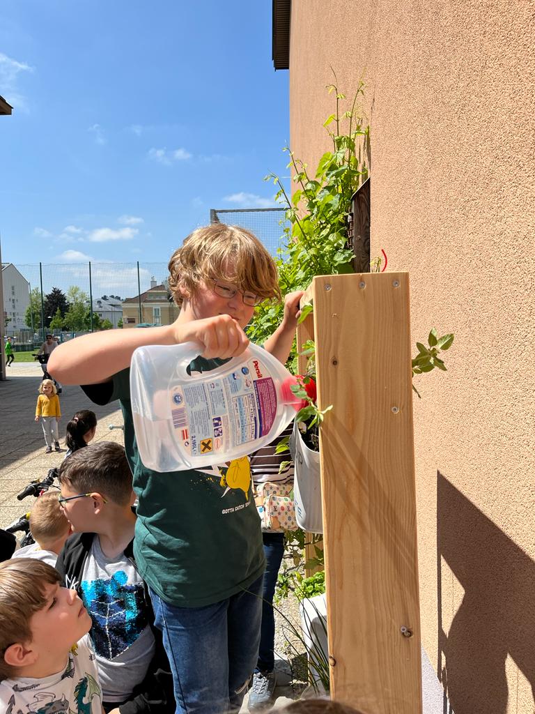 Die 4A Klasse hat unter der Anleitung von Maria Bader vom Verein iEARN Austria im Rahmen des internationalen Projektes „Don´t waste – create“ mit einem Upcycling Gartenprojekt begonnen. Aus übrig gebliebenen Brettern vom Terrassenbau wurde ein Gestell gezimmert. Unten befindet sich eine Kiste, in die dann ein Mörteltrog als Pflanzkiste gesetzt wurde. Als zusätzliche Pflanzgefäße wurden leere Flüssigwaschmittelflaschen im Rahmen befestigt, gespannte Schnüre dienen als Rankhilfen für die Pflanzen.